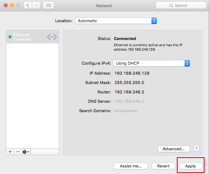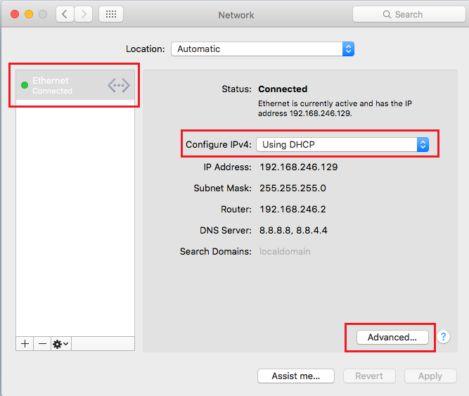 Нажмите на активное сетевое подключение (рядом с его названием будет зеленый кружок), в разделе Configure/Configure IPv4 (Конфигурация) выберите вариант Using DHCP (Используя DHCP) un нажмите на Advanced (Дополнения).