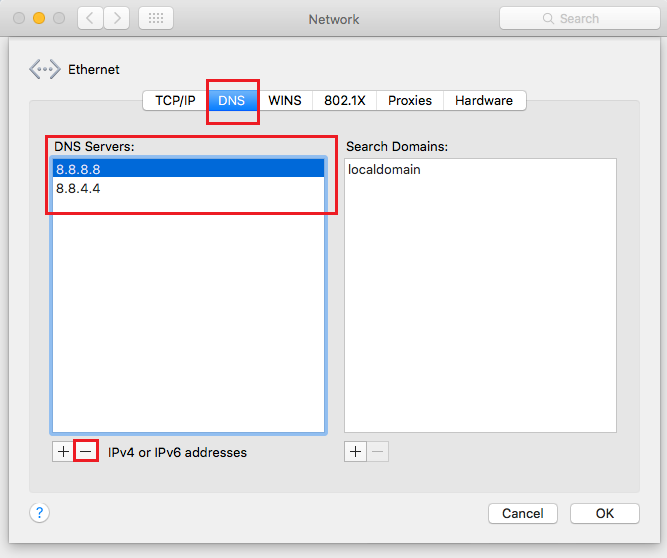 Выберите DNS, выделите IP адрес DNS сервера и нажмите на кнопку удаления, для того, чтобы раздел DNS Servers остался пустым. Нажмите на кнопку OK для сохранения изменений.